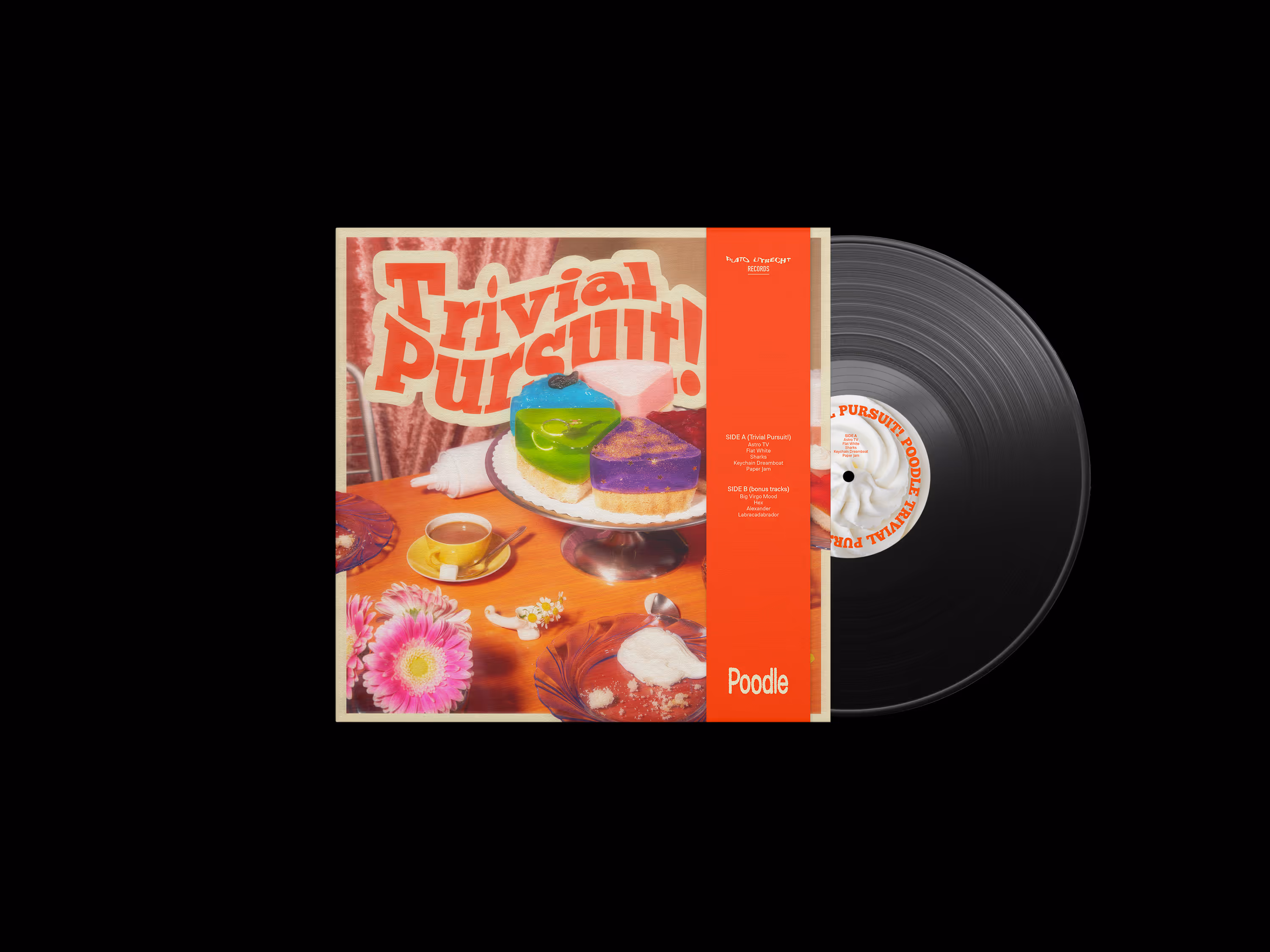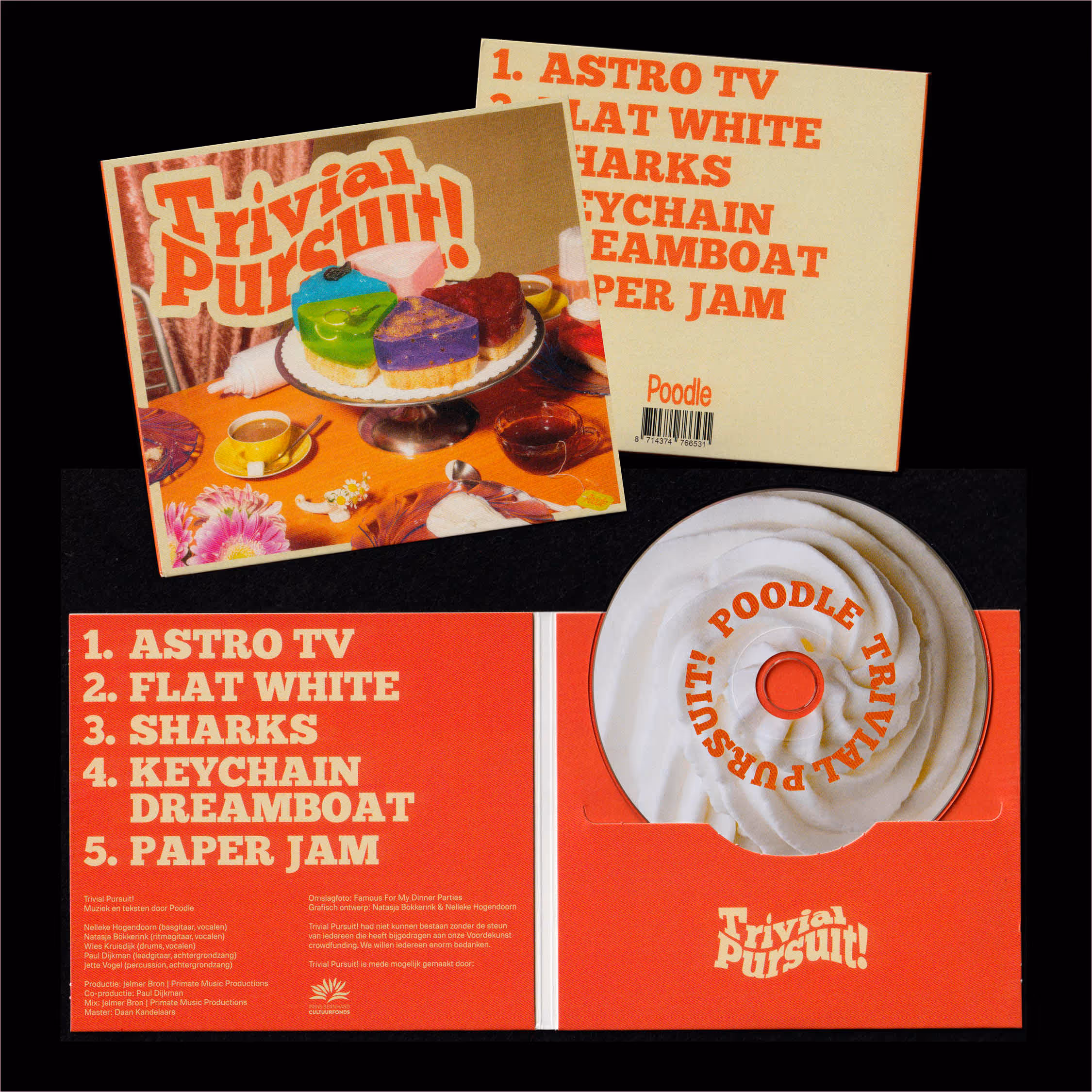 Conceptually using the pie elements of the Trivial Pursuit boardgame, to emphasize Poodle’s humour and playfulness that is present in their songs.